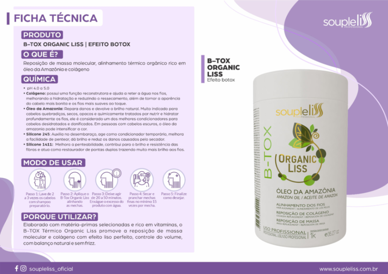 O B-tox Organic Liss rico em colágeno e livre de formol proporciona aos fios reposição de massa, uma potente reestruturação capilar duradoura e efetiva fornecendo aos fios a reconstrução de sua fibra, gerando cabelos mais bonitos, saudáveis e cheios de vida.