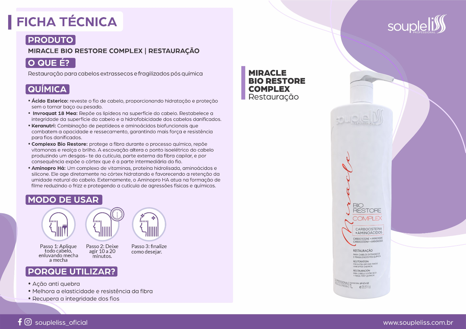 O Miracle Bio Restore Soupleliss Professional foi desenvolvido com diversas matérias primas para devolver vida ao cabelo, entre elas o bio restore e keranutri, potentes reconstrutores a base de carbocisteína e aminoácidos que restaura os cabelos extra-secos e fragilizados por processos químicos, confere selagem das cutículas, repara os fios de danos externos, aumenta a densidade folicular, tem ação anti térmica e reposição de massa.